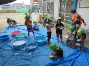 くじらクラスの子どもたちがみんなの泡の準備…