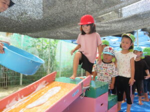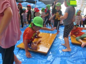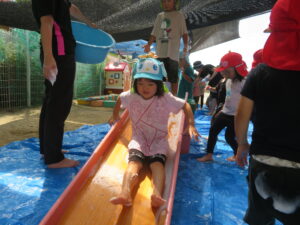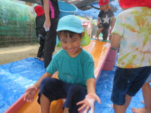 作った泡をすべり台に乗せて滑るとスーッと滑ることができ、大喜びの子どもたち😁