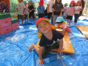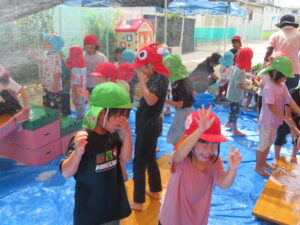 最後は体の泡を落とすため水を全身に浴びて「キャー」と言って大喜びの子どもたちでした✨