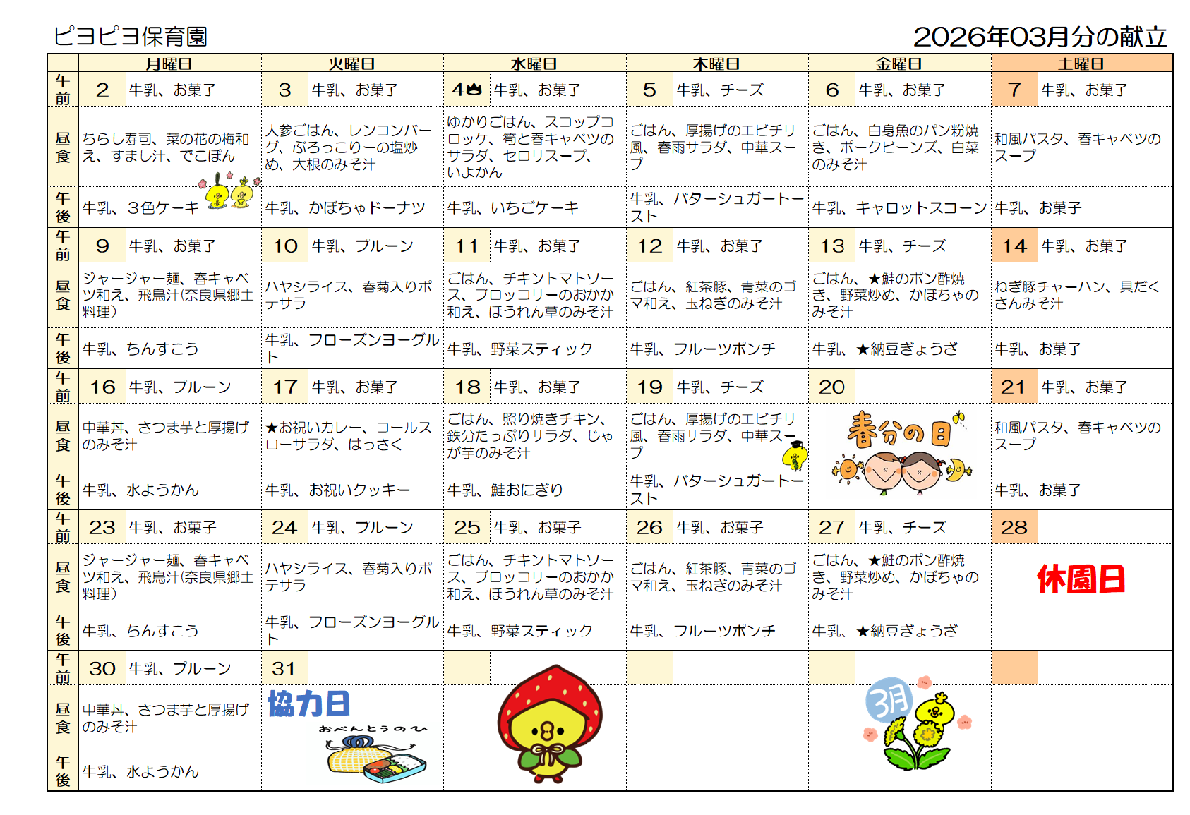 身体をつくるために調理方法、食材、行事と季節に応じバランスを考慮した献立、野菜作りの体験を通してこどもたちの食への関心を高める食育を行っています。